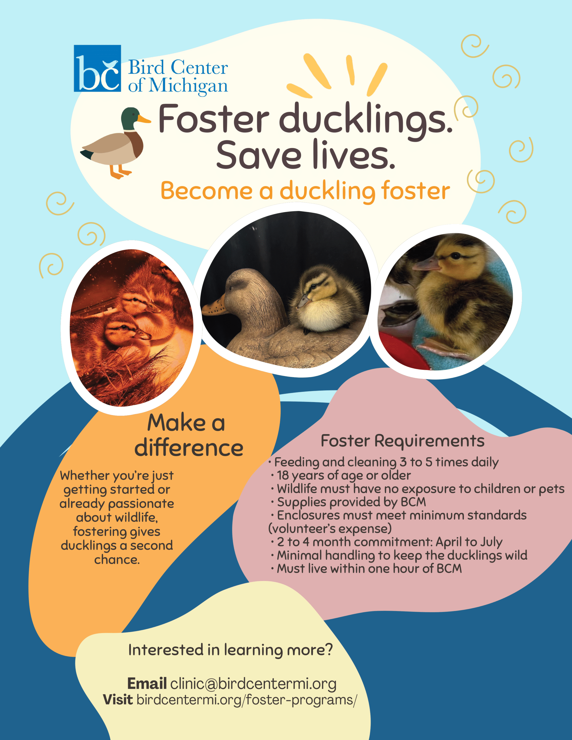 If you’re interested in fostering Mallard ducklings during the 2026 baby season, please contact us at clinic@birdcentermi.org for more information.